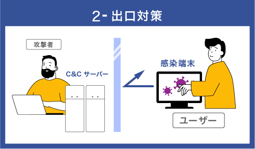 「侵入をさせない」すなわち入口対策では、攻撃者や有害なWebサイトなどから配信される、インターネットを経由した不正侵入やウイルス付きのメールをブロックします。院内に侵入をさせないことで攻撃を未然に防ぎます。