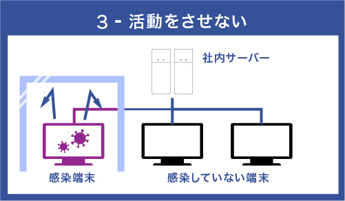 「活動をさせない」すなわち内部対策では、端末のウイルス対策・脆弱性対策、世代管理バックアップ対策を行うことはもちろん、ネットワークの脅威監視・内部拡散防止を行います。感染してしまった端末からさらに拡散するなどの活動をさせないことでウイルスの拡散を防ぎます。